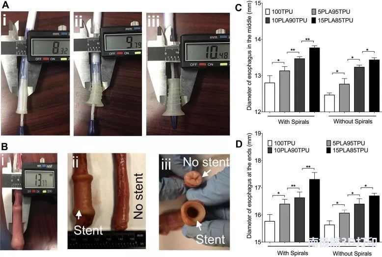对于移植手术而言,不仅要考虑支架植入时对人体造成的影响,还要考虑移出支架后的并发症。于是,研究人员研发出了由医用柔性热塑性聚氨酯(TPU)制成的管状聚合物支架,其韧性、耐久性、生物稳定性和机械性能都比较强,并且是可生物降解的。 四种类型的支架以0,5%、10%和15%的重量进行3D打印,并分别命名为100TPU,5PLA95TPU、10PLA90TPU和15PLA85TPU。研究人员加工了几种不同尺寸的原型,有些则带有颜色。结果发现,螺旋形的15PLA85TPU支架扩张最多。 研究人员总结道:“ 与非螺旋形支架相比,3D打印螺旋形聚合物支架具有显著更高的抗迁移力,螺旋结构显著减少了迁移距离。最重要的是,支架可以通过3D打印定制,以满足不同的治疗需求。”